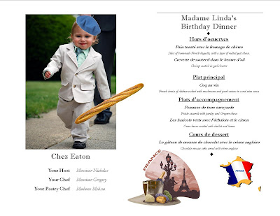 It was harder than I'd thought to put a beret on Nick's head, but I managed. By the way, neither Greg nor I are fluent in French, though we both had several years of high school French. I used an online translator.