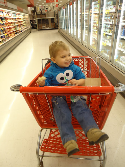 Earlier this week, Nick and I went on a little excursion to the Target. Check out his cookie monster sweatshirt. Nicholas is my cookie monster indeed, and he especially loves the vanilla scones at Starbucks. Note the crumbs all over his clothes.