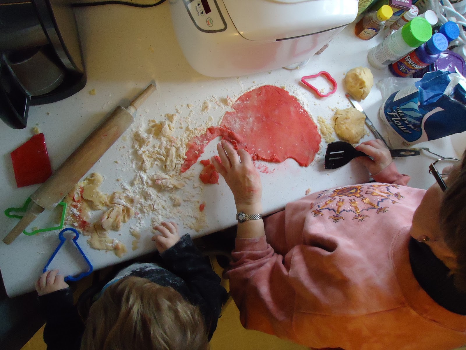 Now, Grandma Toni is no fool, and she didn't underestimate the messiness of this fun project. So she planned to bake cookies while I was home on spring break, so that there'd be two adults to manage the mess. Smart lady. Nick helped with every single step of the process, from the mixing to the rolling to the coloring to the cookie-cutting.