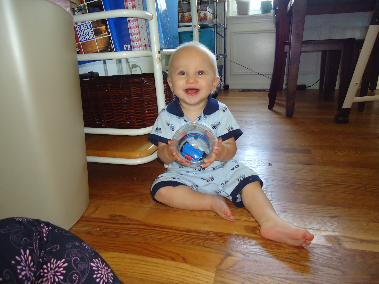 So. . . all of those toys, and he's just as entertained by a simple plastic cup. He reminds me of our cats. I used to buy them all kinds of toys, and they'd prefer to play with the plastic piece from the milk carton, a piece of dryer lint, or a ball of tinfoil.